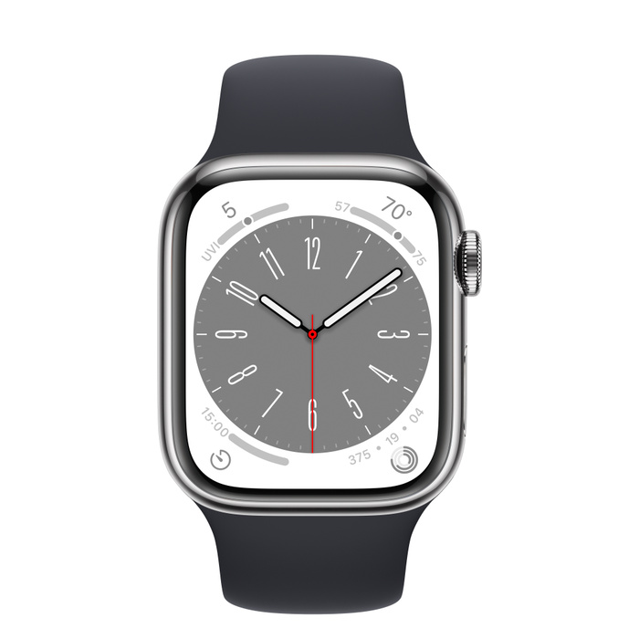 Apple Watch Series 8 45мм серебристый корпус из нержавеющей стали и ремешок Sport Band Midnight